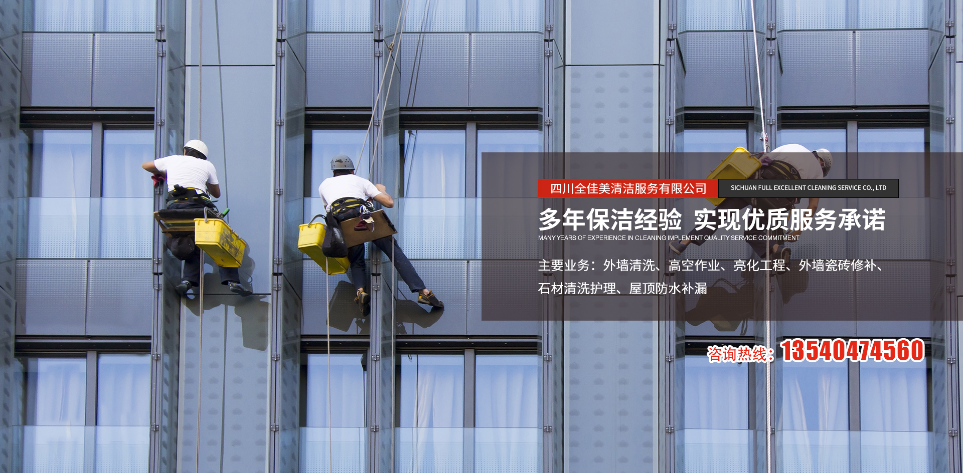 四川全佳美清潔服務有限公司成立于2017年11月20日,注冊資本200萬元人民幣,是一家專業(yè)從事高空外墻清洗,外墻維修,開荒保潔,石材養(yǎng)護,外墻防水等一體化的工程服務公司。公司先后服務于成都鐵路培訓學校,雙流空港酒店,省體育館等寫字樓及工業(yè)園區(qū)的外墻清洗保潔及維修服務。經(jīng)過多年的發(fā)展與努力,公司已具備一定的規(guī)模及實力?,F(xiàn)擁有一支技術精湛的服務團隊,以高標準的服務品質(zhì),專業(yè)的安全技術實力,為全川不同群體的客戶提供更安全,更周到的清洗服務解決方案,期待與你的合作。